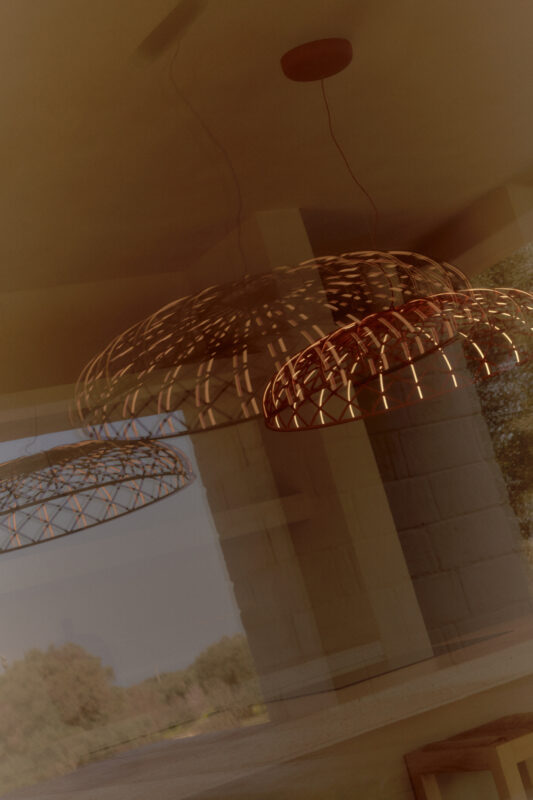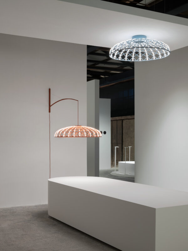 Skynest is in fact composed of 24 LED light sticks covered with a two-tone textile texture. The light is emitted from one side only, the white one, while the color of the fabric remains visible on the outside. The intersection of the various light elements with 48 other colored rods on both sides gives life to the lamp: an ethereal, very light presence, clearly inspired by the world of craftsmanship yet unexpectedly technological.