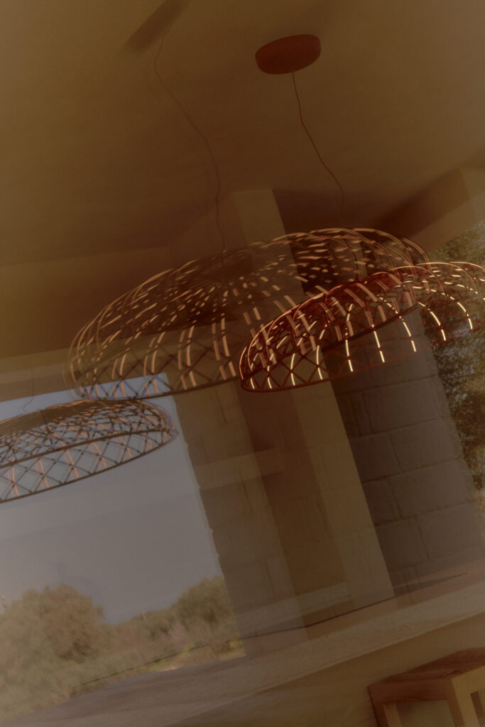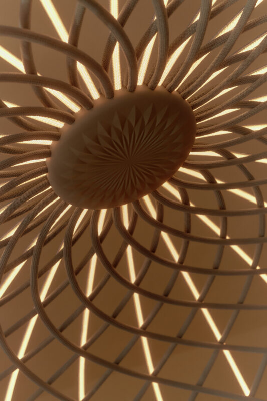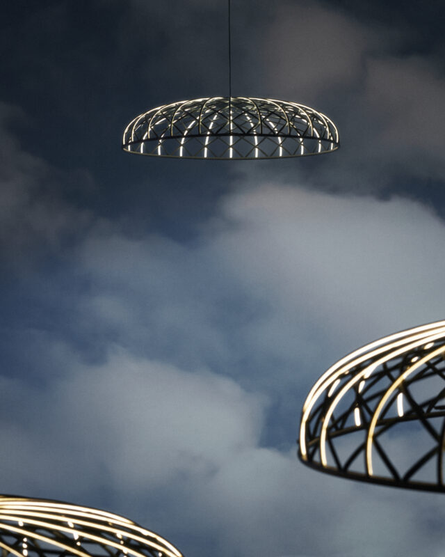 “By weaving streaks of light, this pendant perfectly combines elegance and innovation. Delicate textile tubes, integrated with LED lights, are woven like threads along the structure of the lamp creating a unique surprise element that challenges the archetype of bulb lighting. Designed to last, Skynest poetically blends the tradition of handcrafted weaving with innovative lighting techniques to create a timeless piece of design”. Marcel Wanders studio