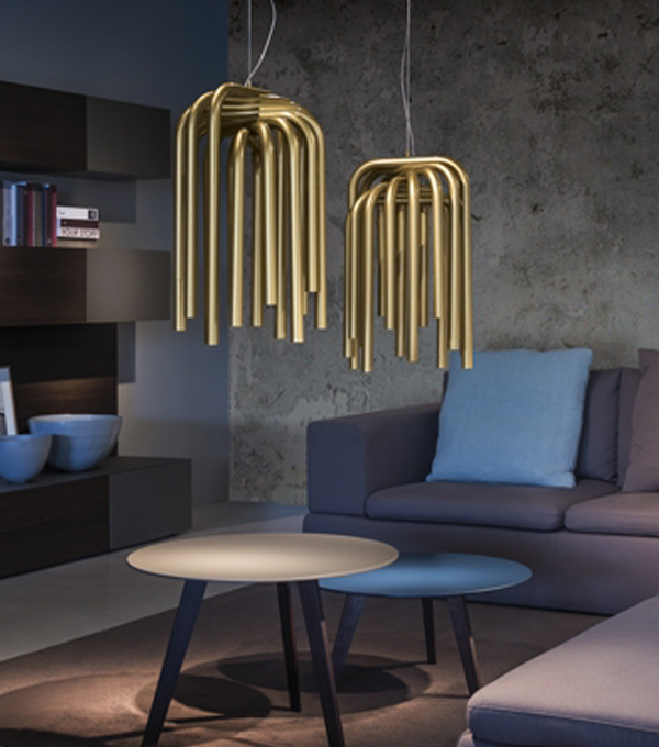Icone lamps are created through the fusion of metal, fabric, glass and light: points of energy that illuminate rooms, curves that define spaces, volumes that emphasize details.