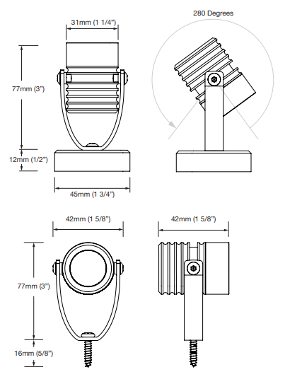 The Modux One Spike Spot with integrated glare guard is a very small low-voltage dimmable outdoor spot light with a solid metal spike for installing into garden soil. The fully adjustable spot light typically produces 80 lumens.
