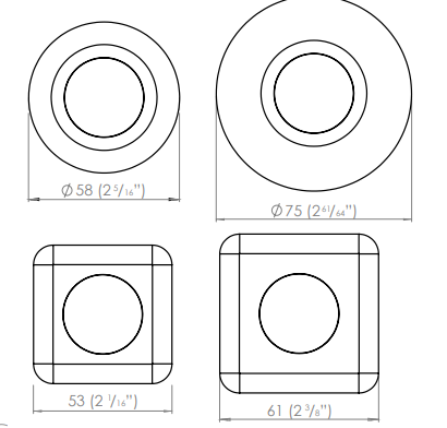 The Modux Two Square Recessed Plug is easily installed. Mark out the luminaire position and have the wiring terminated at the location ready to receive the fixture with suitable connectors. Using a 41mm or 15/8” holesaw, cut a neat hole accurately in the surface where the fixture is to be mounted. Route the wiring out of the hole and electrically terminate the product. Fold the spring wings back against the body and inset into the hole. The flange will sit flush with the wall when fully inserted.