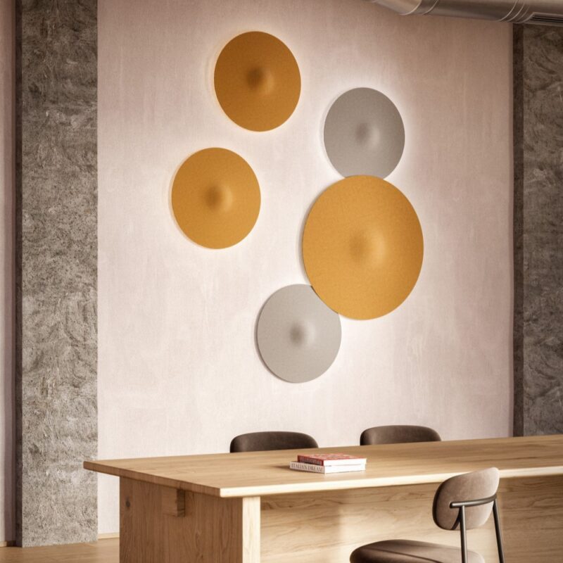 The wide, slim shape of the Acustica lampshade is inspired by the cymbal of a drum kit, but reverses the musical concept by absorbing sound from the space, to create a high level of acoustic comfort. Acustica is ideal for use in public spaces such as restaurants and luxury offices, as well as large waiting areas.