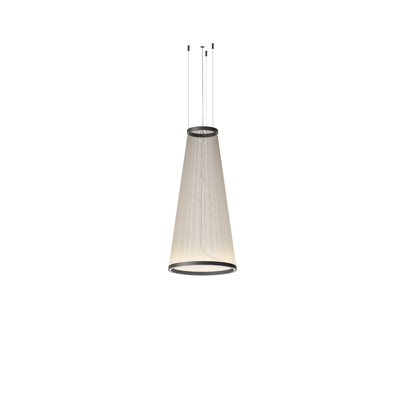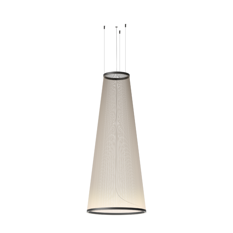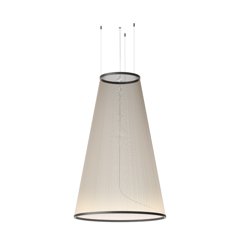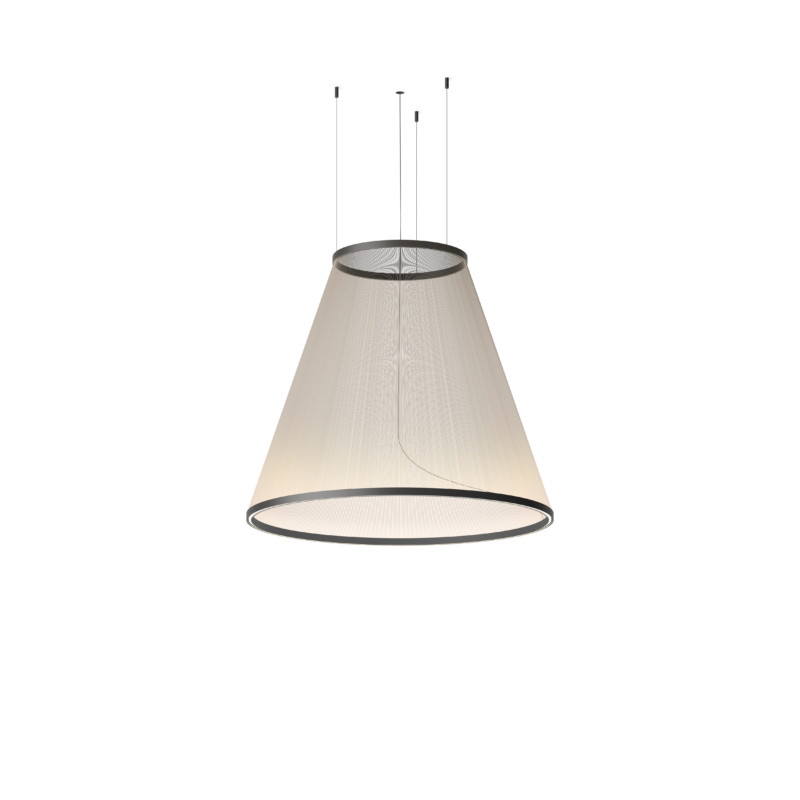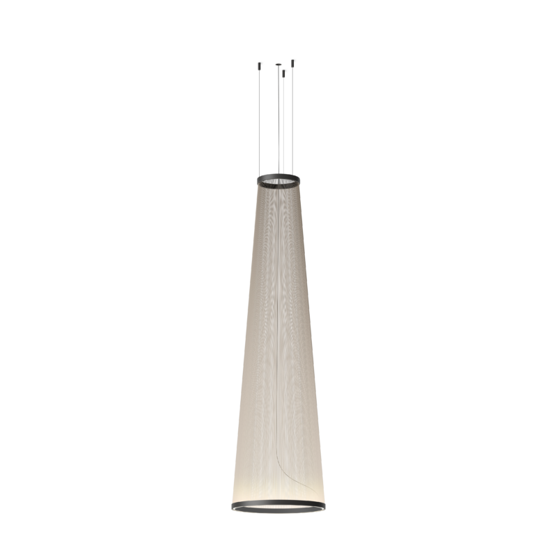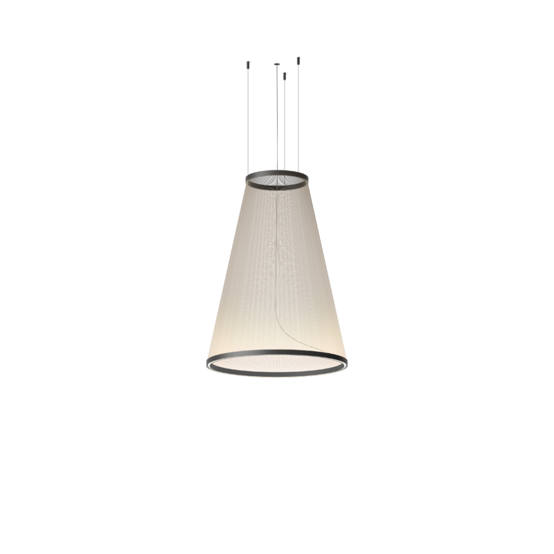 The large-scale conical silhouette hanging Array lamp wraps around the space rather than dominating it thanks to the spacious spread of the filaments creating a translucency