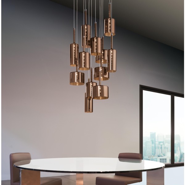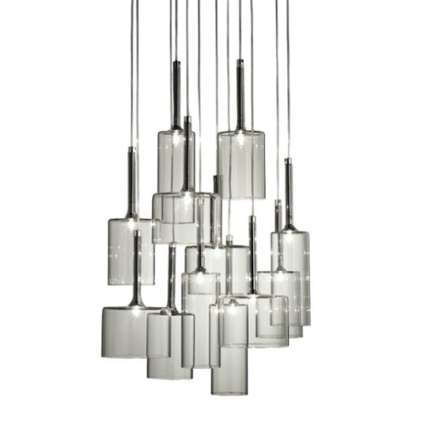 The Spillray collection is composed by pendant lamps, ceiling lamps and wall lamps made of glass available in crystal, red and grey, with chrome-plated metal frame.‎ The hanging lamps, with one, three, six, ten and twelve lights are also available in metallic bronze.‎