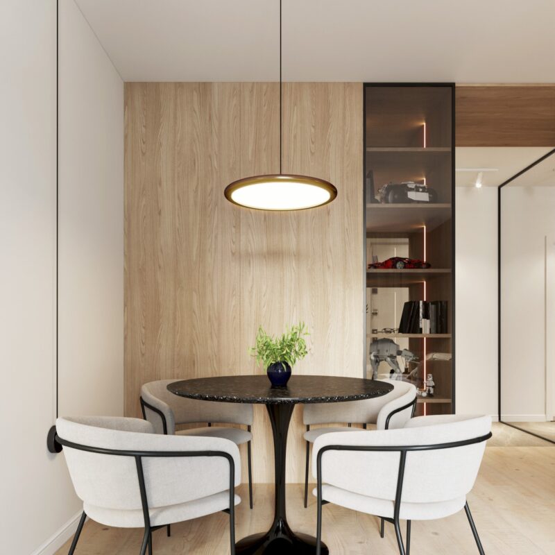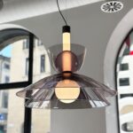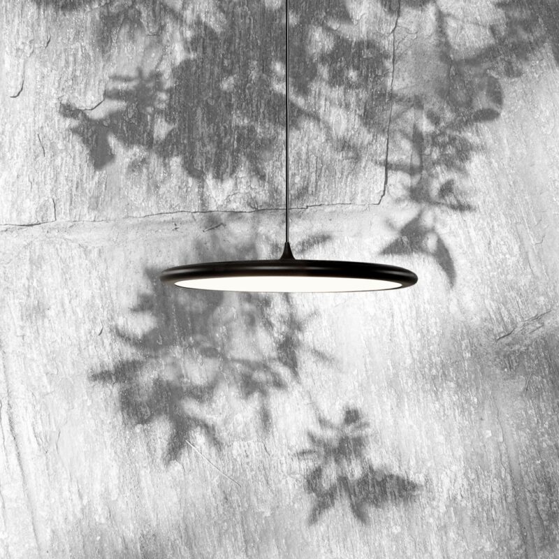 Suspension, ceiling and wall lamp with a thin metal powder coated diffuser. The decentrate version has a versatile ceiling mounting system allowing to illuminate even in absence of electrical connection on the ceiling. In addition, the metal decentralizers allow the wire to slide to bring the light where it is needed. Thanks to its essential form, the light spreads evenly throughout the environment.