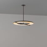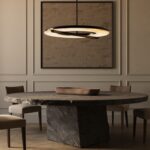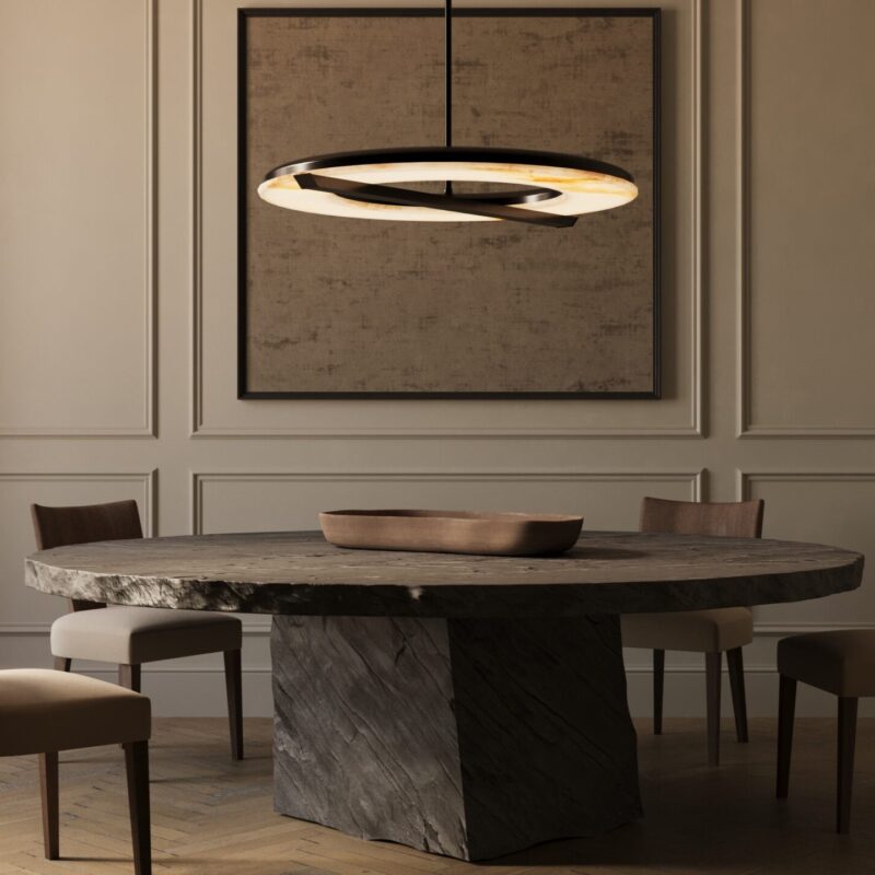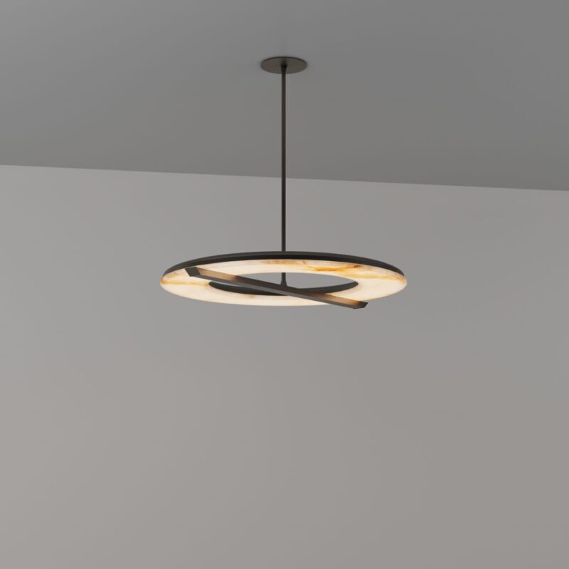 The CERES Pendant reimagines the chandelier with celestial elegance and architectural clarity. A luminous alabaster ring floats beneath a sculpted metal dome, anchored by a horizontal bar that adds graphic definition. Emitting a warm, diffused glow, CERES is ideal for dining rooms, reception areas, or open-plan spaces. Fully dimmable, this pendant balances futurist form with timeless refinement – a bold centrepiece designed to elevate contemporary interiors.