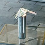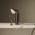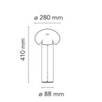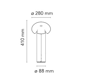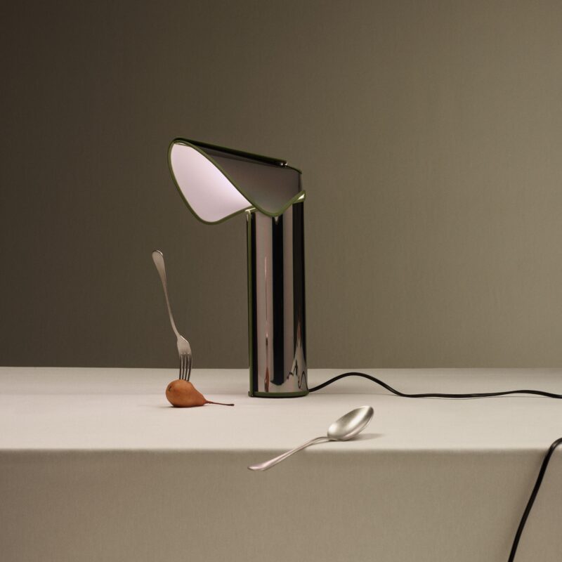 Table lamp composed of a reflecting body in aluminium in 3 colour variations, finished internally with an opaque white plastic film and folded and closed via hooks riveted to the sheet metal. A coloured seal in moulded tpu runs along the entire profile of the body. The internal base in extruded aluminium is attached to the body for stability and it also supports the bulb socket. The power cable has a dimmer switch to adjust the brightness. Usable cable length: 1.9 m