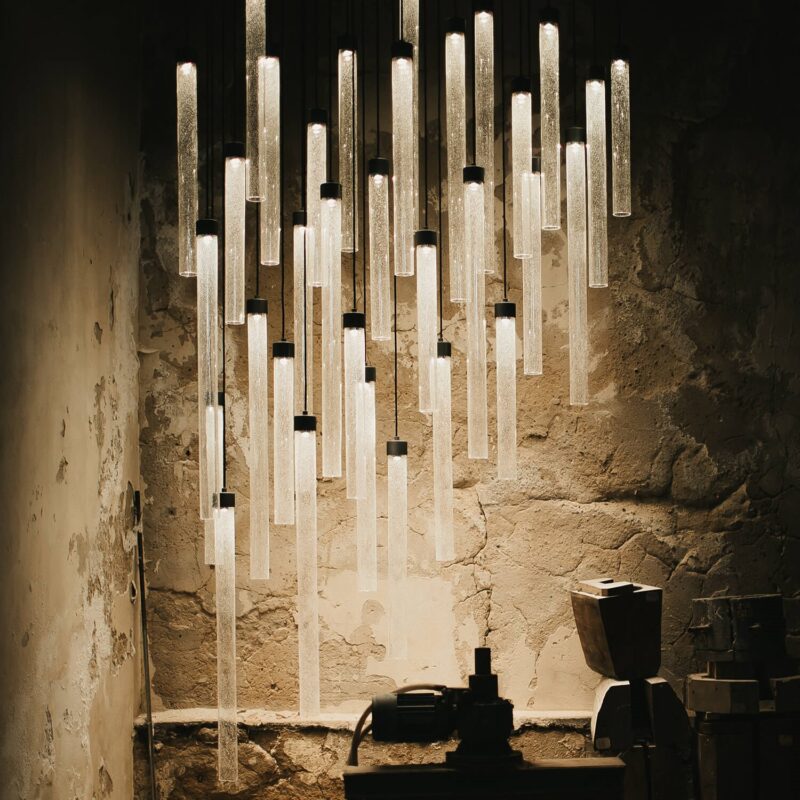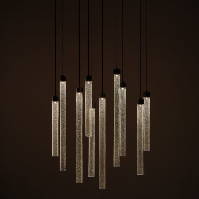 Each Comet is handblown from laminated glass, with grains of silica sand added between the layers to render a unique celestial effect that gently diffuses the light throughout the surrounding space.
