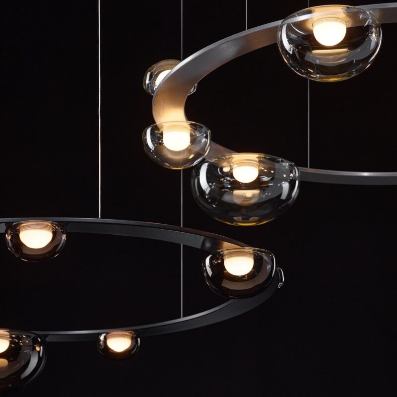 more monumental, spatial form: a ring that can be suspended above a dining table, kitchen island, or lobby area to create a striking, elegant lighting accent.