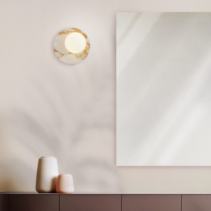 The use of marble, a key element of the collection, makes Emma an object of true design that adds a vibrant glow to any surface. The base in the table version, and the wall and ceiling supports, are made of green Guatemala or white Calacatta marble; the diffuser is a charming white opal sphere that, thanks to its pure essence, spreads