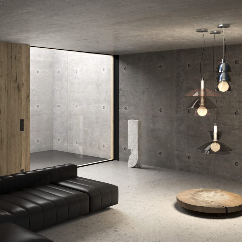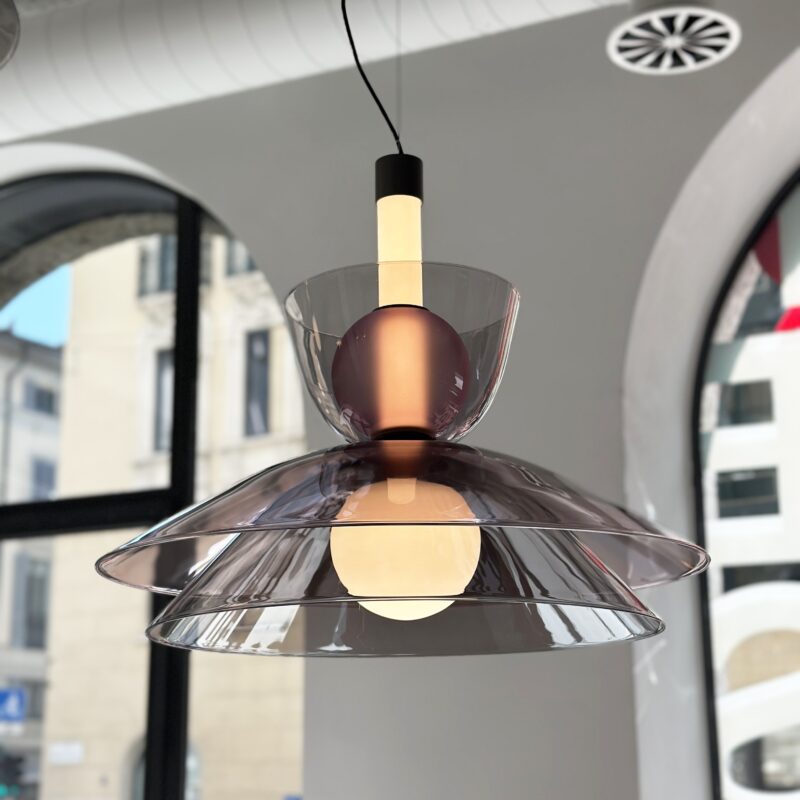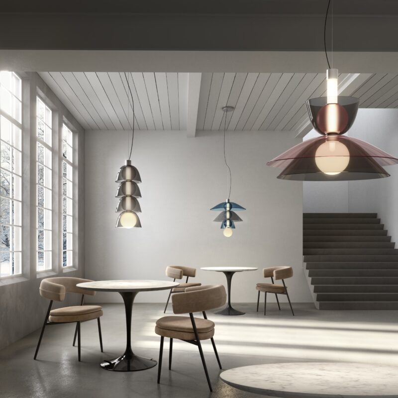 A lighting system composed of six combinable elements: three shades in growing diameters fit onto a light source provided with a sphere and a tube. The various combinations, which are potentially infinite, are spread through a kaleidoscope of soft and gradient colours immersing the environment in a suggestive atmosphere. An intricate dovetailing game that is solved technically in an at once articulated and simple manner, like precious pearls delicately strung on a necklace of light with subdued transparencies that shape a marvelous prism of visual effects as they enter into play with the diverse textures of the finishes.