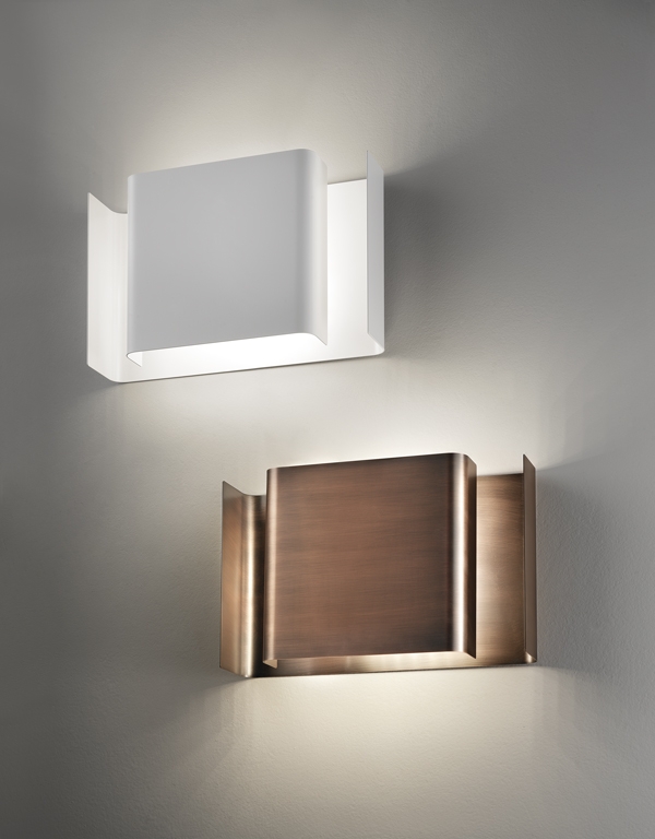 Alalunga is a LED wall lamp with light fitting in matt white painted metal or the exclusive “brushed bronze” finish.