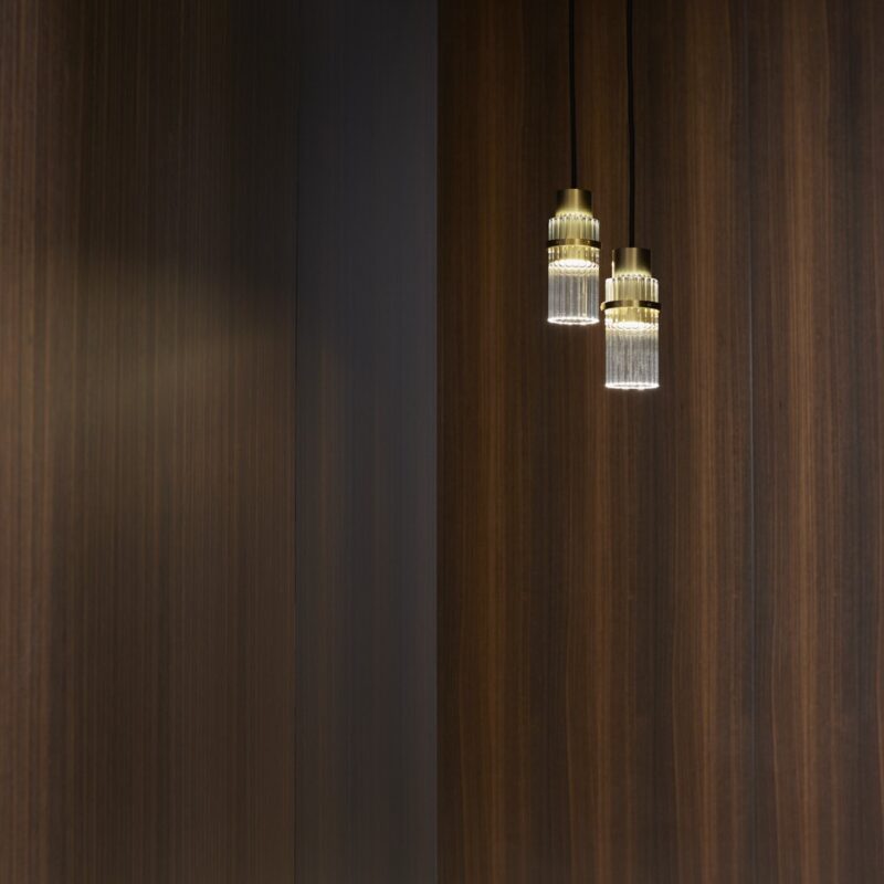 In a world of spotlights with a masculine feel, Lei emerges: a system of technical spotslights with a crystalline and elegant aesthetic, based on curved elements that evoke the grace of the feminine universe, such as sartorial pleats and the sophisticated workmanship of precious perfume bottles. Available in matte black, brass, nickel and titanium finishes with clear and frosted glass or smoked, bottle green and red available on request. Lei is destined to capture every eye that passes, with its brilliant aesthetic presence.