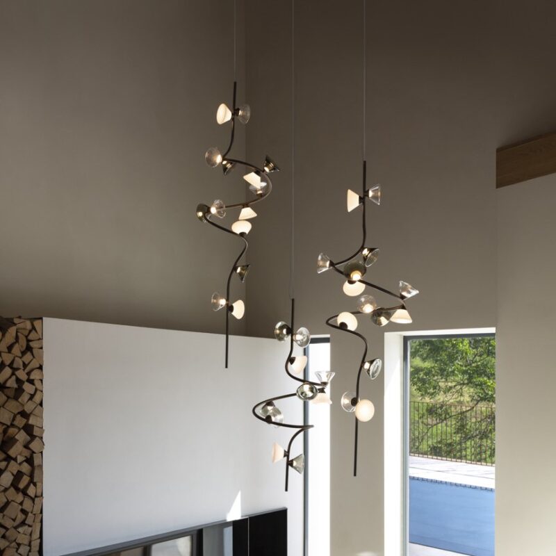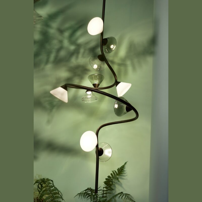 Inspired and characterized by the natural world, the Linfa family of lamps designed by Federico Peri unfolds on arms so sinuous and elegant as to evoke the veins that run through the leaves, with bright points of light that shine like dew drops. In this family, made up of pendant, floor, table lamps and wall sconces, the refined branches are available in gold, titanium or matt nickel finishes, while the light sources, made of Murano glass, are available in smoky and transparent finishes or milky white.
