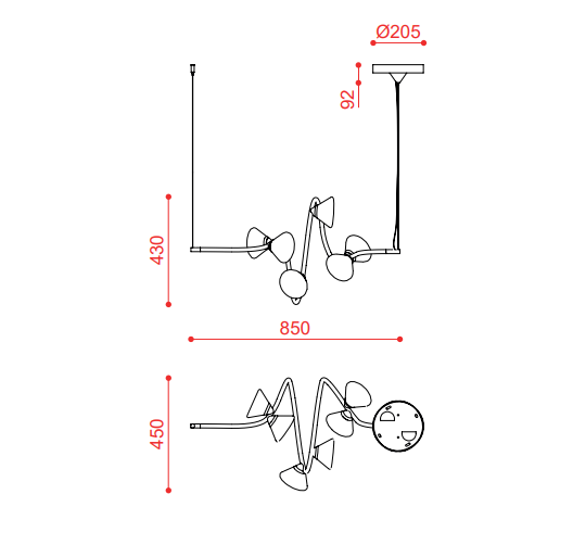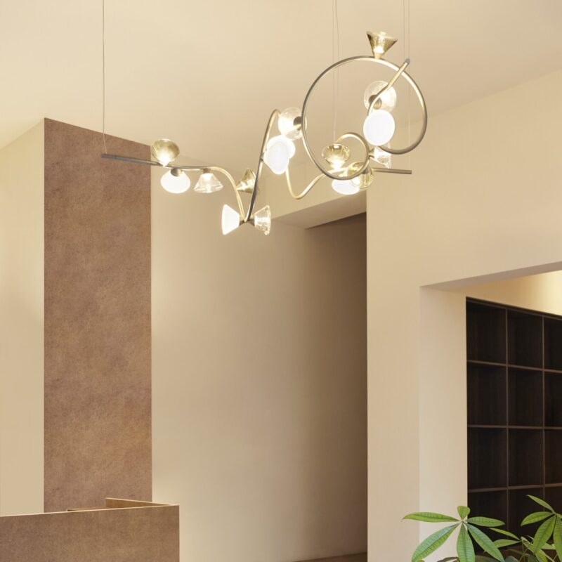 Inspired and characterized by the natural world, the Linfa family of lamps designed by Federico Peri unfolds on arms so sinuous and elegant as to evoke the veins that run through the leaves, with bright points of light that shine like dew drops. In this family, made up of pendant, floor, table lamps and wall sconces, the refined branches are available in gold, titanium or matt nickel finishes, while the light sources, made of Murano glass, are available in smoky and transparent finishes or milky white.