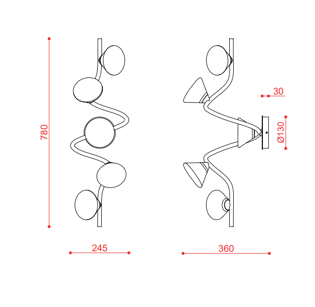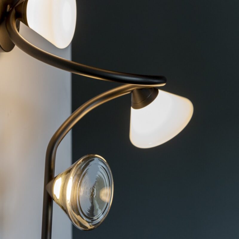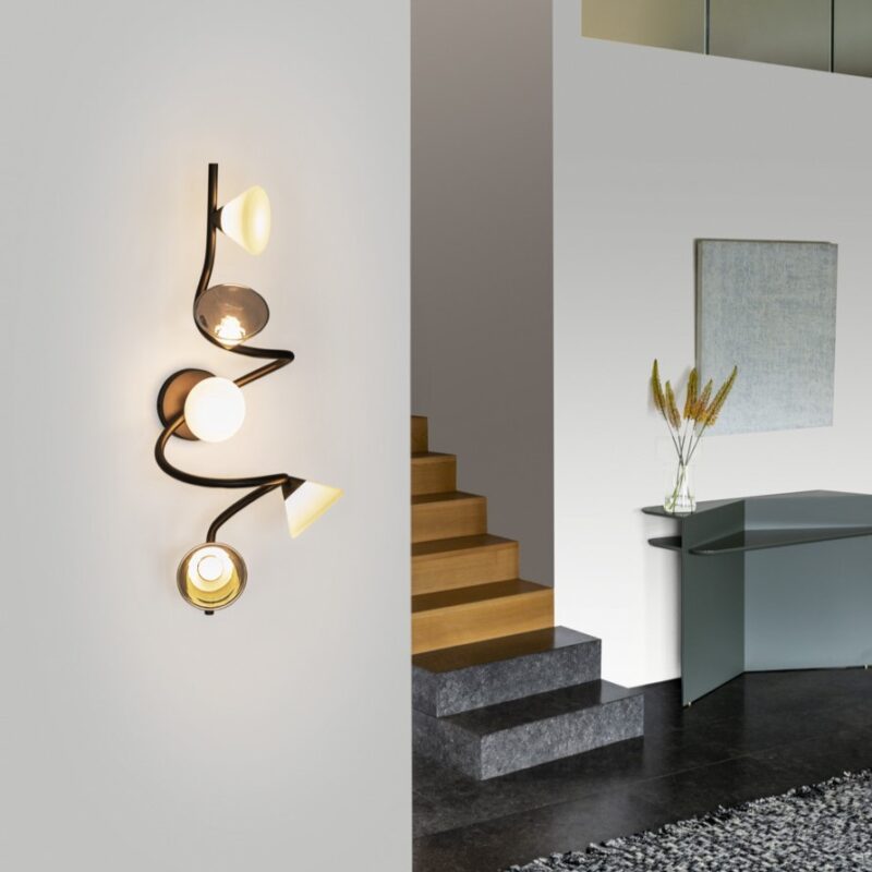 Inspired and characterized by the natural world, the Linfa family of lamps designed by Federico Peri unfolds on arms so sinuous and elegant as to evoke the veins that run through the leaves, with bright points of light that shine like dew drops. In this family, made up of pendant, floor, table lamps and wall sconces, the refined branches are available in gold, titanium or matt nickel finishes, while the light sources, made of Murano glass, are available in smoky and transparent finishes or milky white.