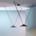 The Mayfair collection by Diego Fortunato reimagines the traditional, 19th-century French bouillotte lamp in a modern design. Available as a pendant, table, or floor fixture, its sleek steel stem bisects the spherical shade in an elegant interplay of lines and curves.
