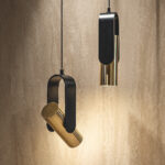 The Nastro collection of suspension, wall, floor and table lamps designed by Studiopepe sees an epoxy powder coated aluminum band structure accompanied by a cylindric weight that counterbalances its flexuosity, in a refined visual balance. The light source consists of a dimmable LED strip; the cylinders are available in epoxy powder coated metal, in wood, in brushed brass and in raw concrete.