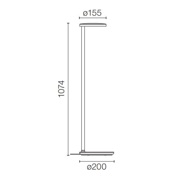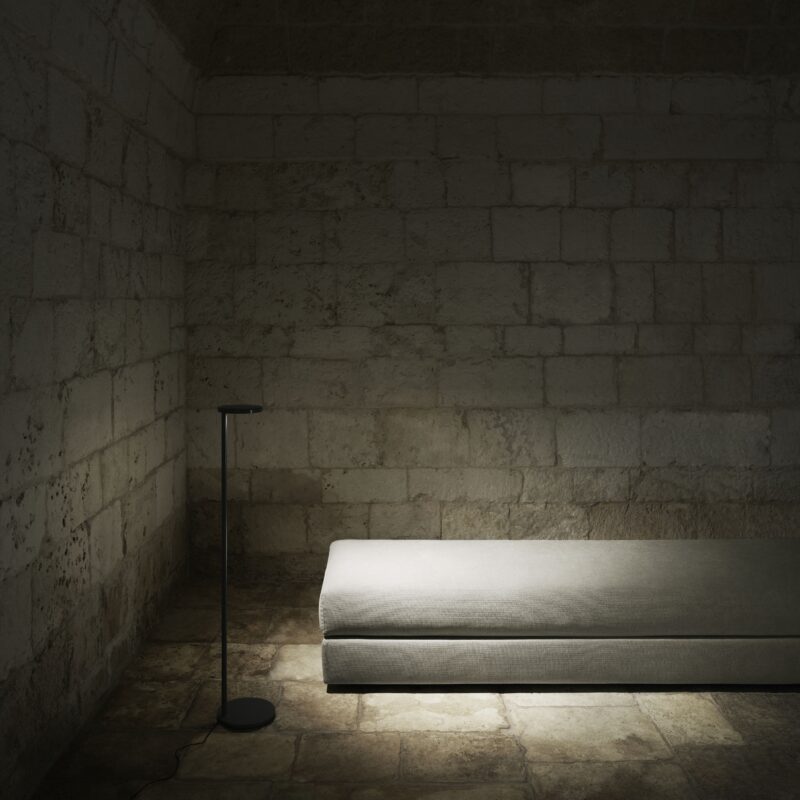 Floor lamp with asymmetrical direct lighting and floor stand. Haptic interaction for switching and dimming. Cast aluminum body. Cast