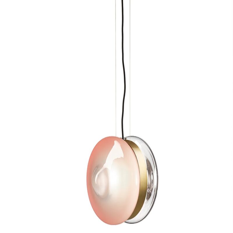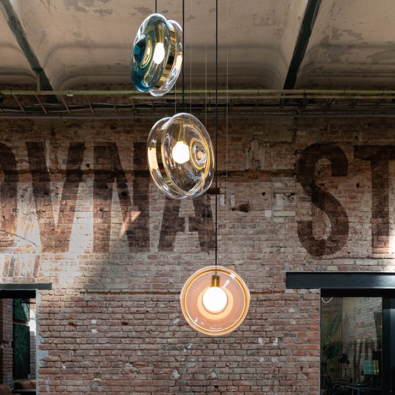 BOMMA’s Orbital traces paths of multicolored celestial bodies that glow with hypnotically red-hot cores. This ingenious design of mouth-blown glass lenses, held together by a metal mounting, creates a fascinating visual experience from many different angles. Our unique lighting objects in moonlight clear, pastel pink, sea blue, polar white and mysterious black, lend a truly magical atmosphere to any sophisticated interior.