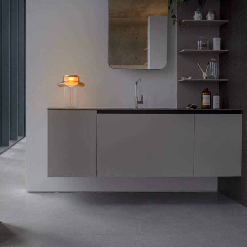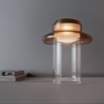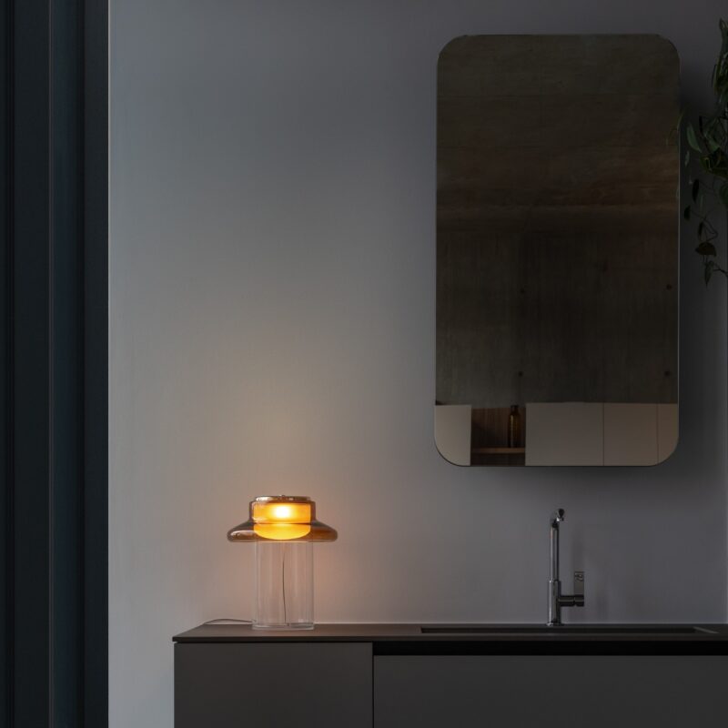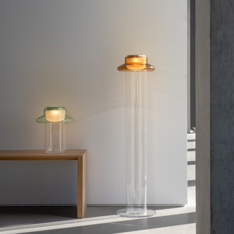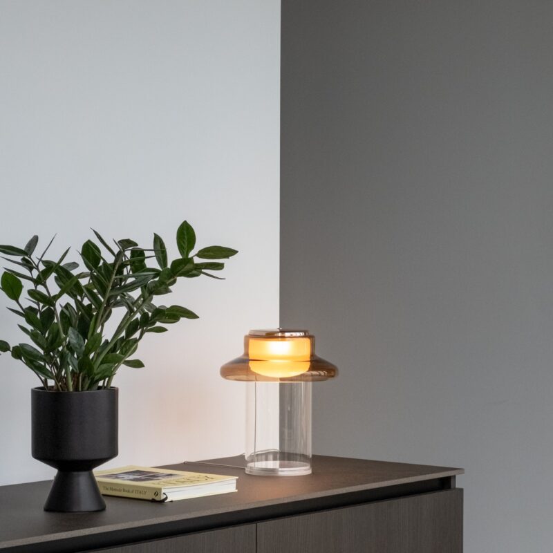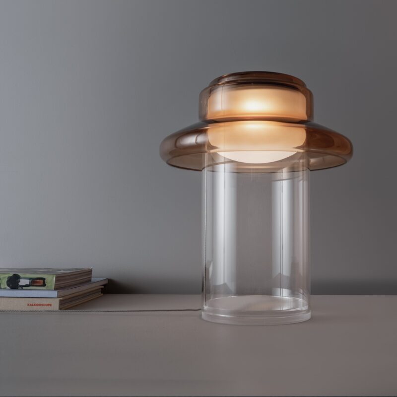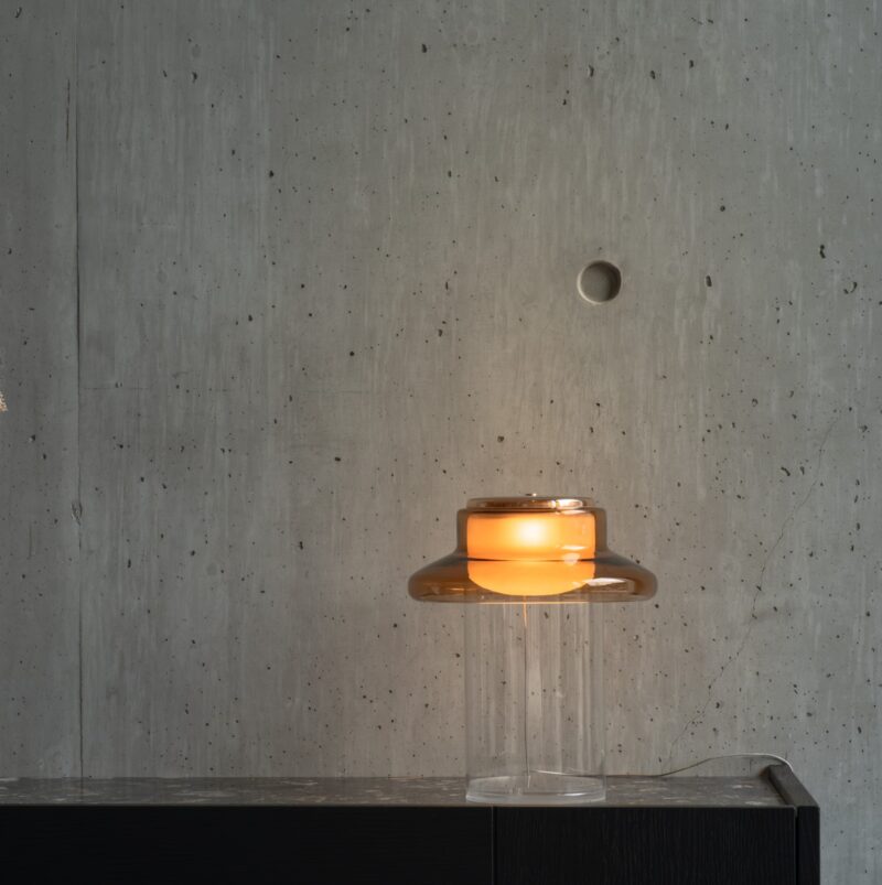 Pace is derived from the notion of rhythm, tempo, and repetition. The interplay of light and material is evident in the gradients and reflections which occur as illumination passes through its consecutive layers of glass. Thin and lightweight the Pace table lamp is distilled to the singular form on which the series is based and positioned on a clear glass base.