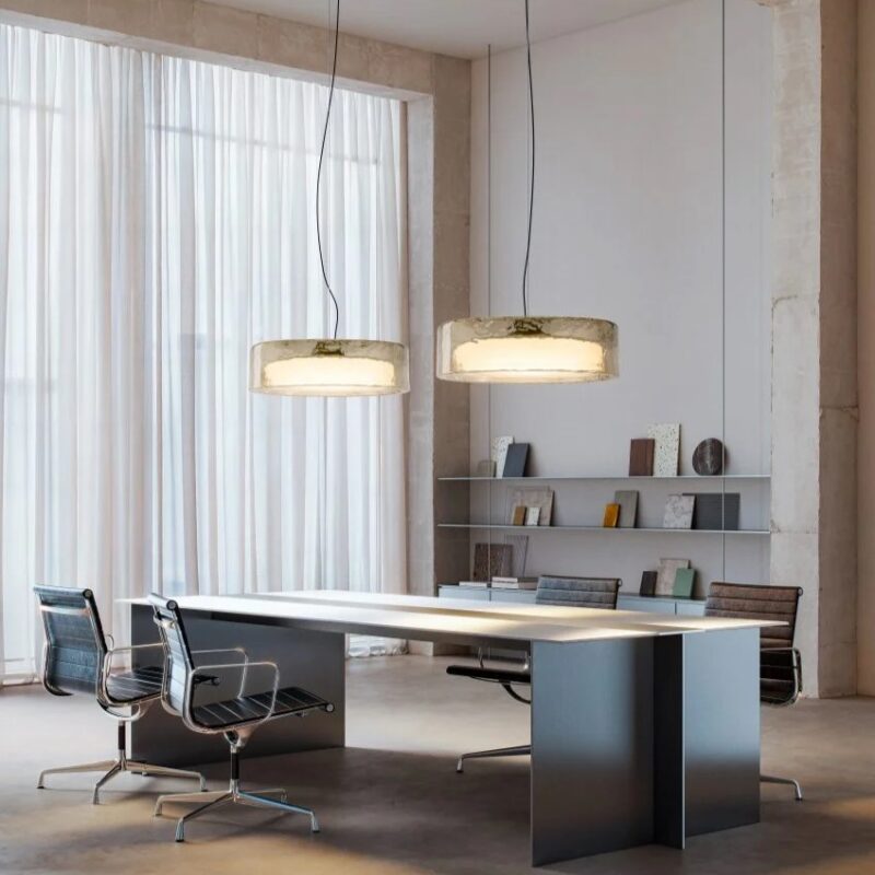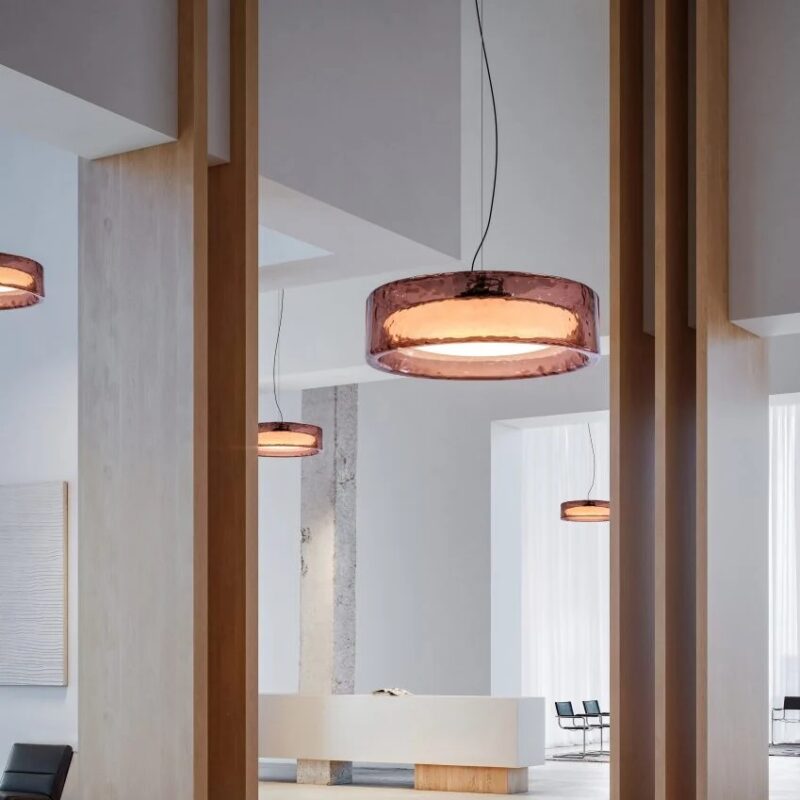 Its large size is in keeping with its function, since it’s been designed to illuminate large and considerably high spaces, contemporary architectural projects ranging from hotels to contract, in which a lot of light is required. Its transparency means that it blends in readily and harmonises with the space, also when repeated. A design with an innovative proposal: its shade distributes and regulates the direct light homogeneously whilst also revealing what’s happening inside.