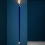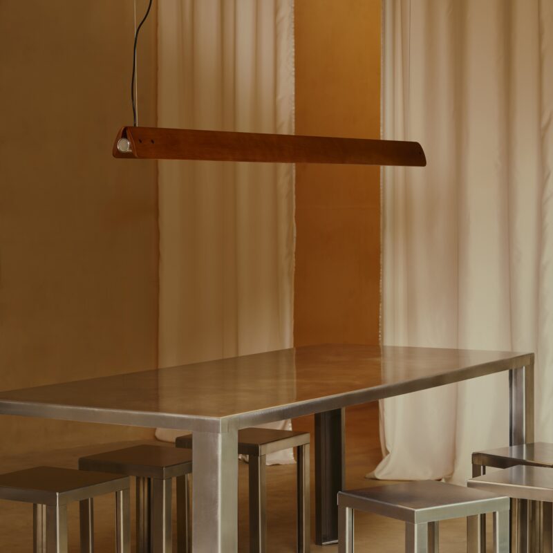 Suspension lamp emitting direct and indirect light with symmetrical and asymmetrical distribution. Features two horizontal ash wood blades joined by chromed metal fittings. Blades rotate around a central tubular light source to allow variable light emission. Custom-developed dimmable linear LED light source. The lamp can also be fitted with standard T8 LED tubes.