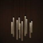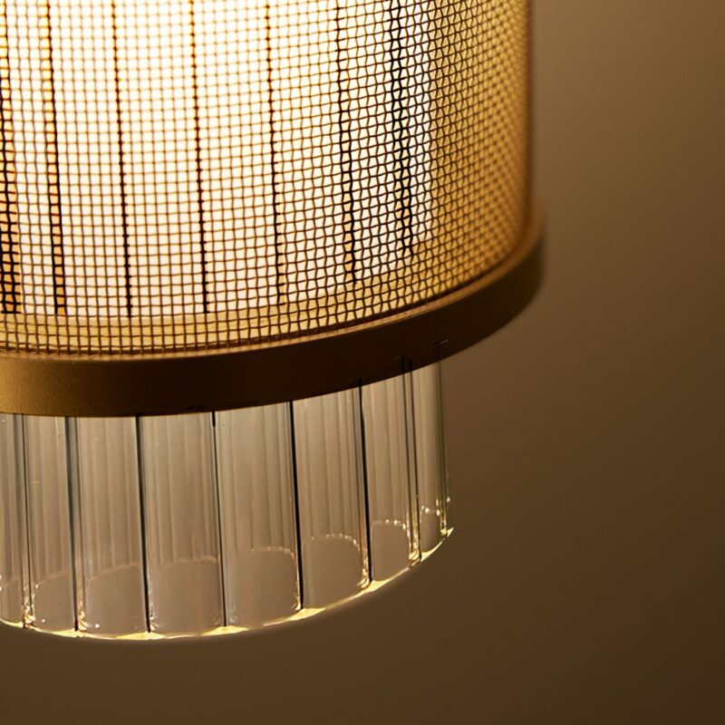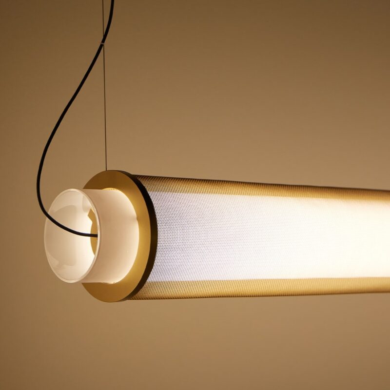 The Slim Skin collection consists of a vertical suspension, a horizontal suspension, and a wall version. All of them have a diameter of 12 cm and are available in two different lengths: 70 cm and 140 cm. Slim Skin is composed of a glass cylinder (available in opal white or ribbed clear glass) coated with a metal mesh in brass or black finish. The metal mesh creates a moiré effect which avoids any glare and provides great visual comfort.
