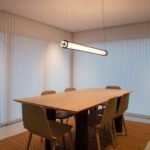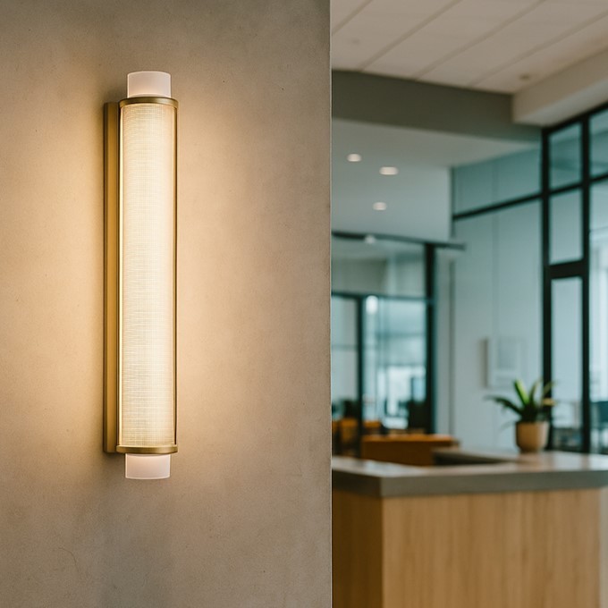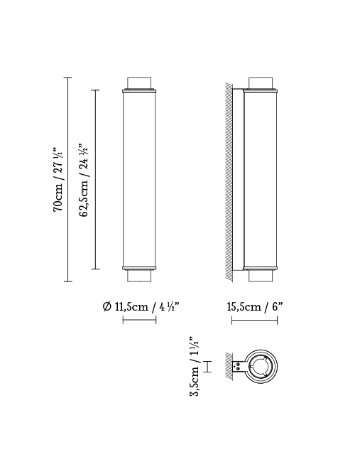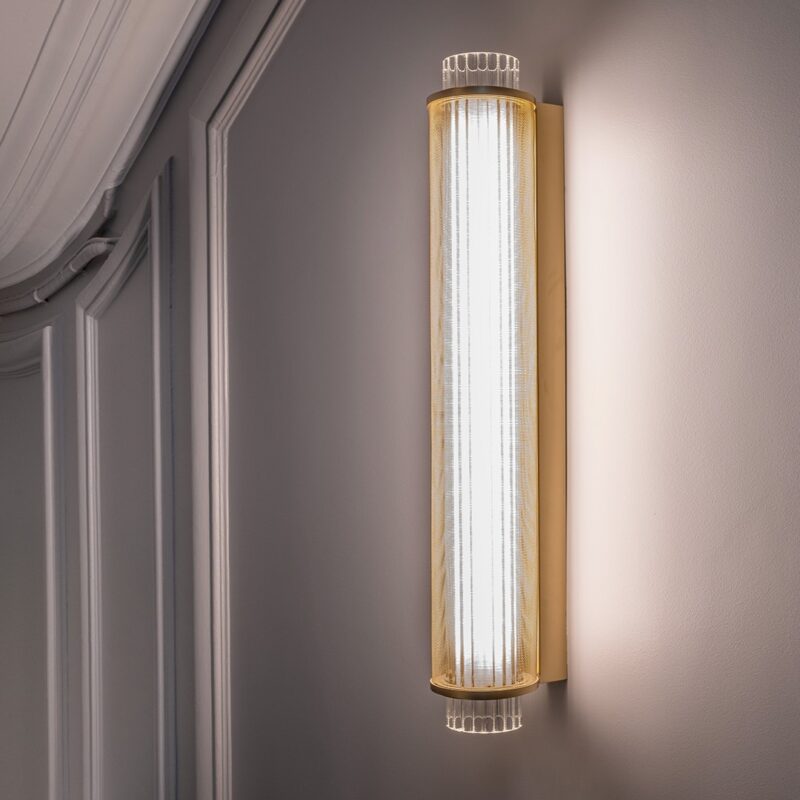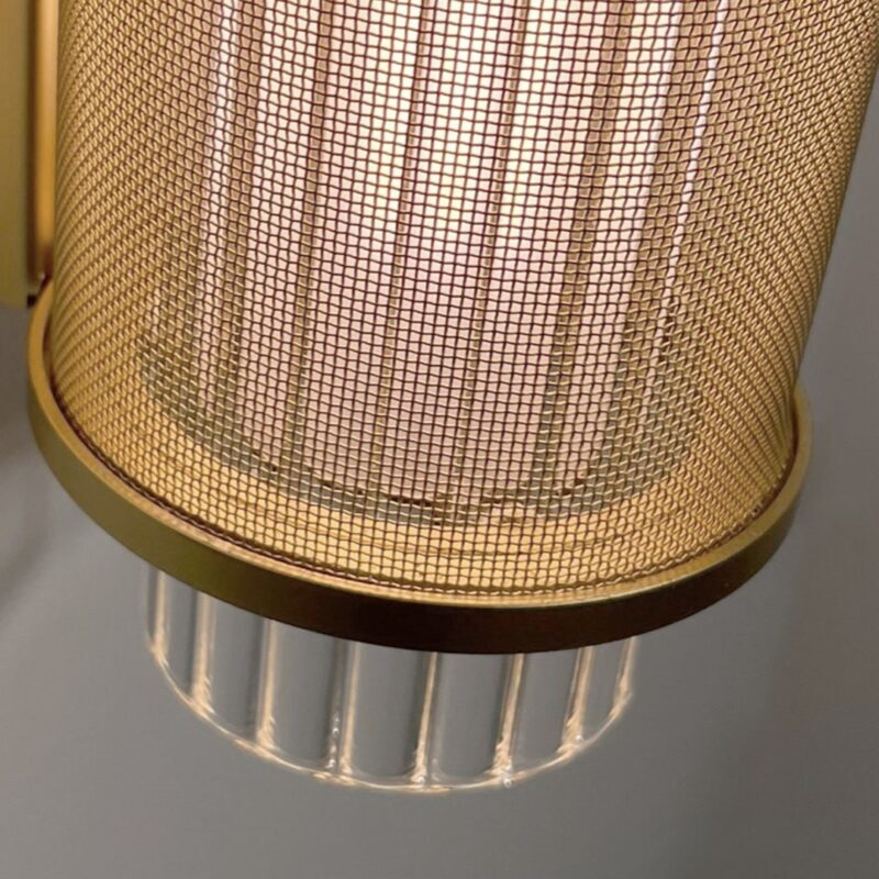 The Slim Skin collection consists of a vertical suspension, a horizontal suspension, and a wall version. All of them have a diameter of 12 cm. Slim Skin is composed of a glass cylinder (available in opal white or ribbed clear glass) coated with a metal mesh in brass or black finish. The metal mesh creates a moiré effect which avoids any glare and provides great visual comfort.