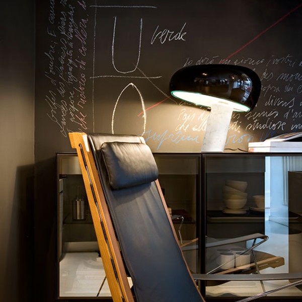 An enduring legend of lighting design, Snoopy was conceived by Achille and Pier Giacomo Castiglioni in 1967 and perfectly embodies a tendency to infuse functional design with a sense of humour. With a silhouette resembling the famous cartoon dog that gave it its name, the lamp’s design has remained unchanged: a slanted marble base supporting an enamelled metal shade held in perfect equilibrium.