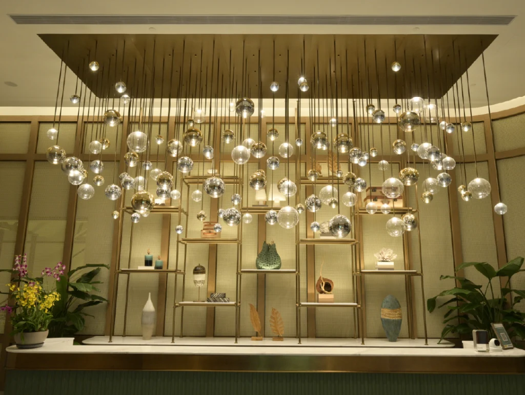 At the Group Bus Entrance of The Fullerton Ocean Park Hotel Hong Kong, the designer from EM Bespoke curated a striking lighting composition by selecting luminaires from the renowned Italian brand LODES and commissioning a bespoke canopy from Zodiac Lighting. To complete this installation, we specially crafted a custom base for the lighting canopies, ensuring both stability and seamless integration with the overall design.