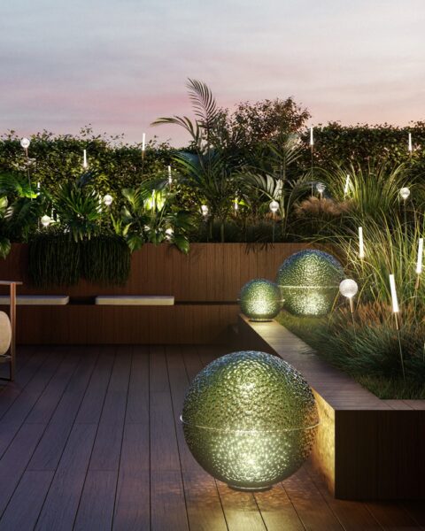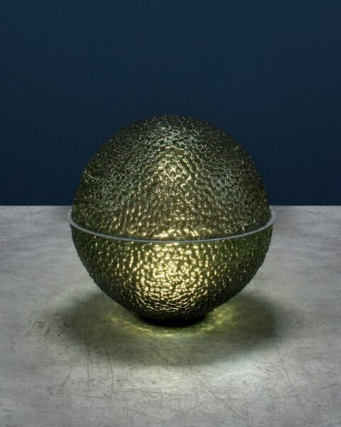 Medousê, a light made of two overlapping glass hemispheres, which is green when switched off, to complement the surrounding landscape perfectly, and an ethereal white when switched on.