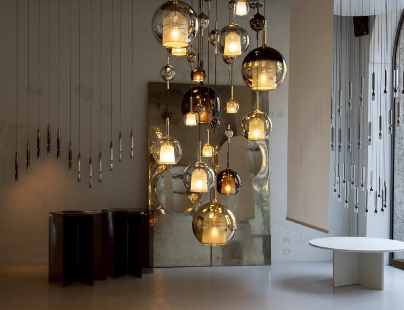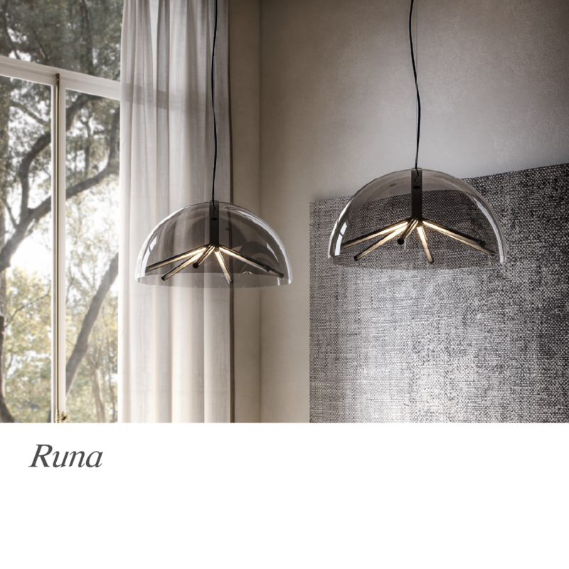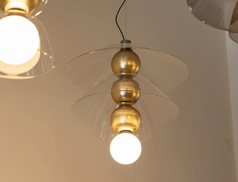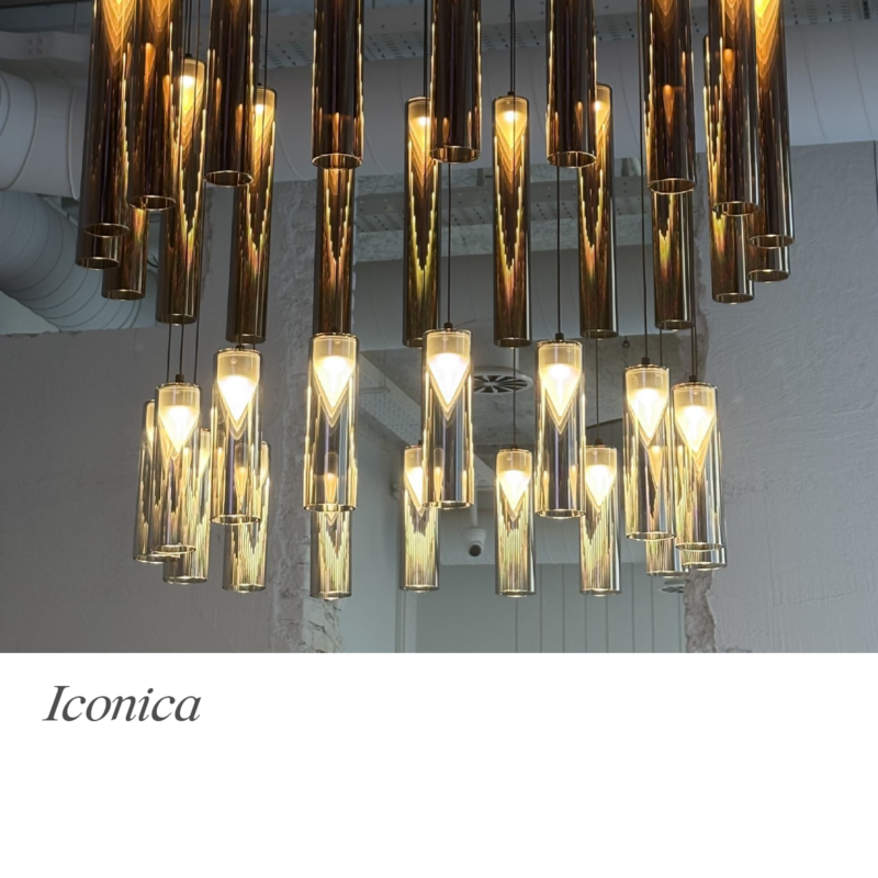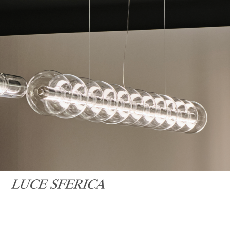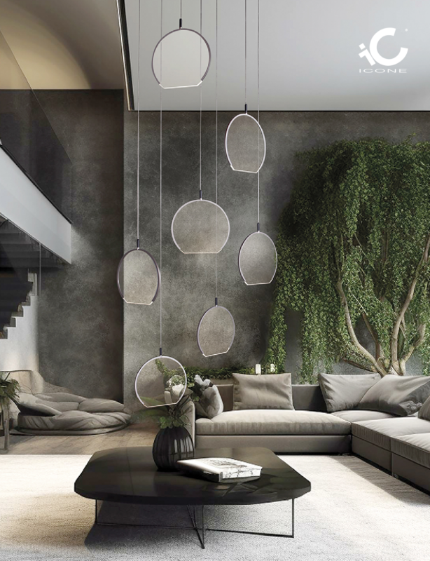 Icone的Ciondolo系列由Marco Pagnoncelli設計,吊燈採用了具透明水晶效果的甲基丙烯酸酯,並配搭擁有24V LED照明的金屬結構。這款燈具提供多種尺寸(S-50,S-70,S-90)與配置。此系列融合流綫型設計與卓越的功能性,旨在為不同空間提供現代化的照明解決方案。