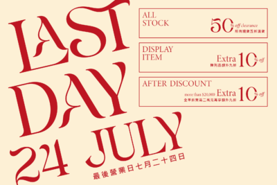 最後營業日:2025年12月15日 清貨倒數!不要錯過這個以驚人價格爲您的空間增添燈具的機會! 💡限時優惠,全場現貨商品一律五折❗而陳列品更低至一折❗ ❗絕對的最後機會,庫存有限,手快有手慢無❗ *優惠受條款及細則約束 門市地址:灣仔摩利臣山道70-74號凱利商業大廈地下及一樓 星期一 至六:10:00 – 19...