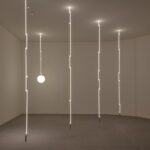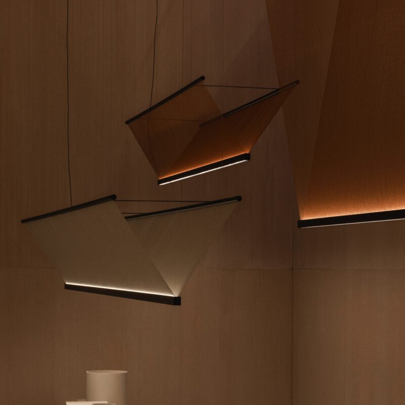 The large-scale conical silhouette hanging Array lamp wraps around the space rather than dominating it thanks to the spacious spread of the filaments creating a translucency