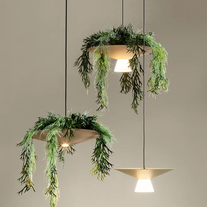 Suspension lamp featuring a metal body, textile cable, optional metal and glass shades. Acrylic (PMMA) lens diffuser, and integrated LED. The metal and glass shades can be arranged in multiple positions and combinations, allowing for customizable designs and light effects. The metal shade comes in three sizes and can be mounted facing up or down during installation. Adjustable height. Individual or multiple canopy, suitable for creating various compositions
