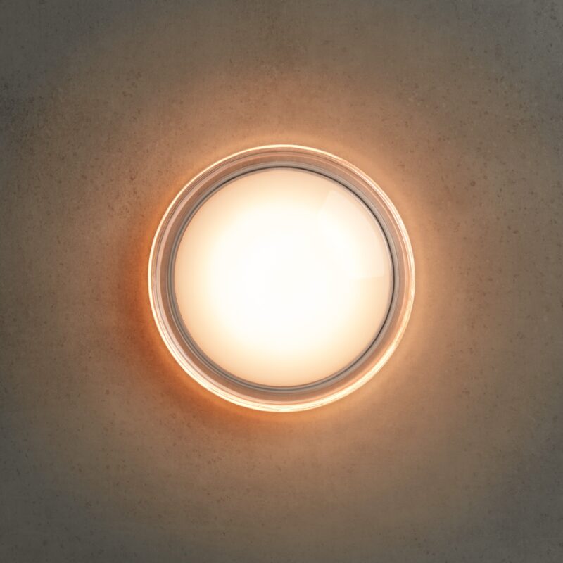 The Dots Glass wall sconce features an elegant glass diffuser. Coated with layers of transparent optical glass along with an aluminium edge detail for each disc creating a pulsating ambient effect. The Led source inside the fitting generates a 360-degree warm ambient light.