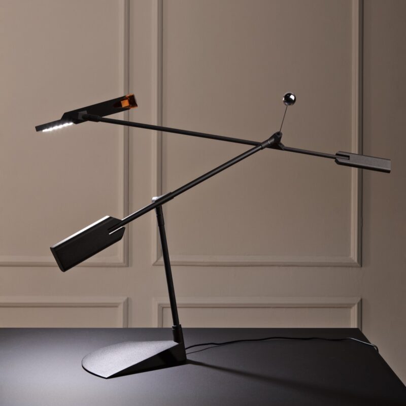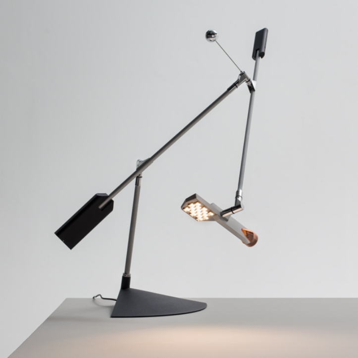 Halley is an orbital structure that literally allows all possible movements while remaining in position, by moving the lamp head using only one hand. With no fewer than 6 joints, each with 360 degrees of rotation, the lamp can move freely in three-dimensional space. The sphere acts as a counter-balance for the weight of the luminaire, ensuring stability.