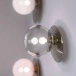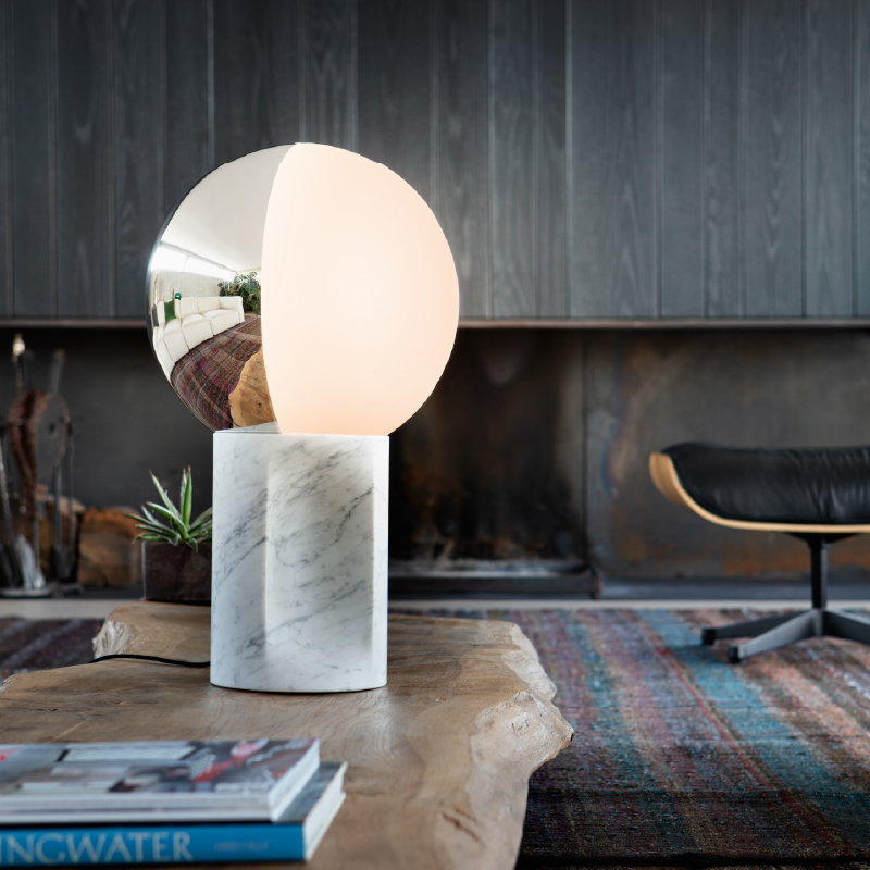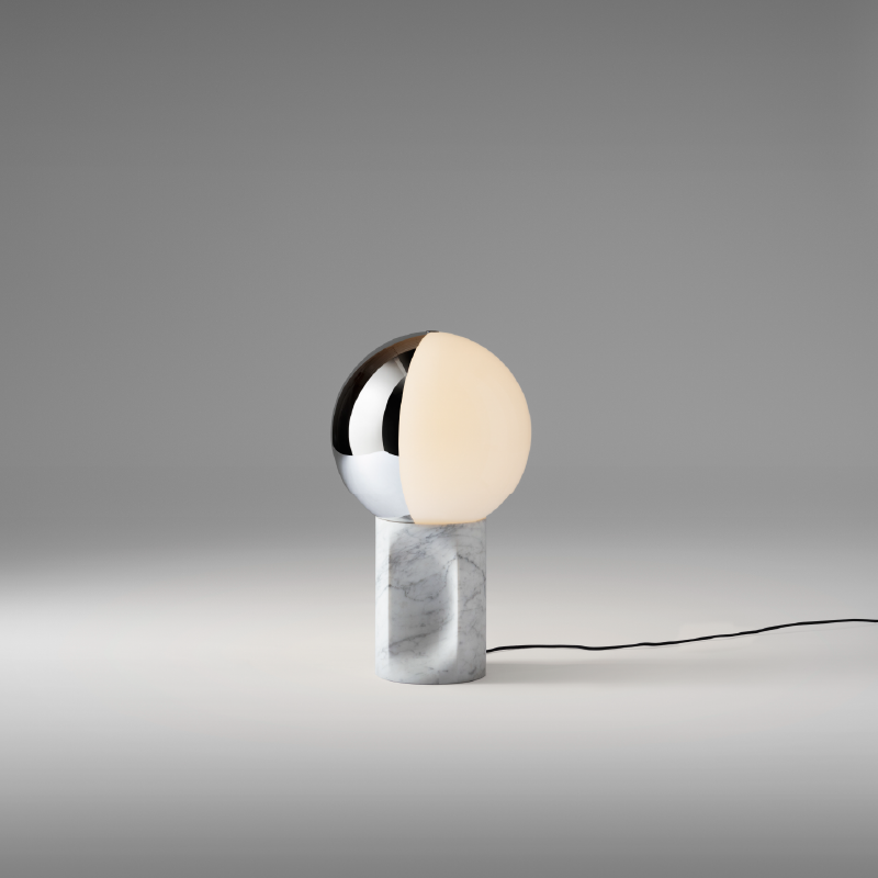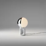 A sculptural lamp formed by a two-coloured sphere in white and silver glass and by a monumental Carrara marble or wood base. Je suis is a declaration of intents, with its rich finishings and the beauty beyond functionality.