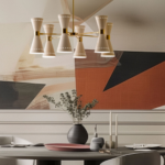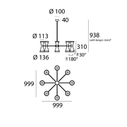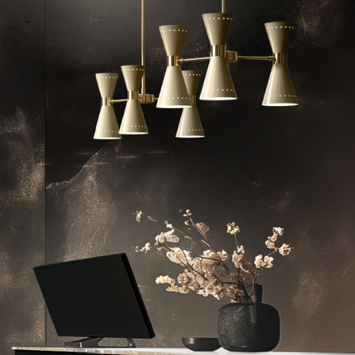Brass body with galvanic gilding, suspended via an interchangeable rigid rod that comes in two sizes (included). Metal lampshades painted in glossy black or ivory. 6W 2700K E14 LED light bulbs included. Brass wire casing.