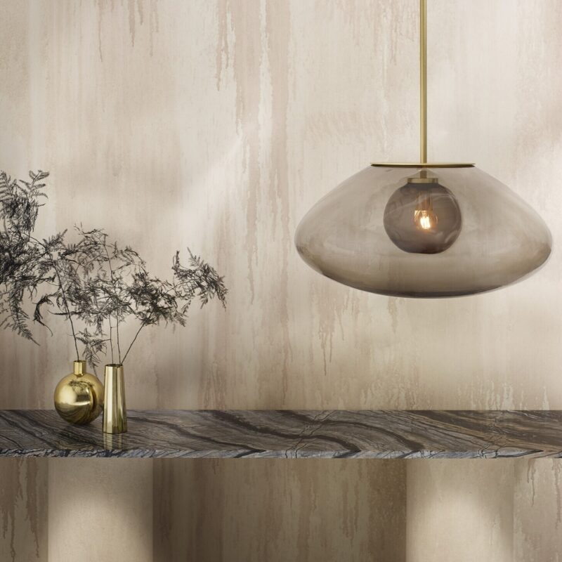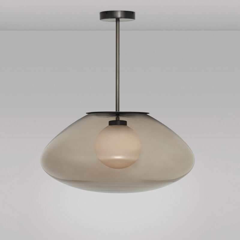 Inspired by the organic quality of glass, the PETRA Pendant Light features a soft meteoric core juxtaposed against a second outer layer of thick pebble-like glass in a tinted neutral pigment. The layered glass shades softly diffuse and deflect light, creating a captivating illumination.