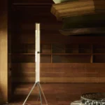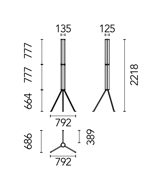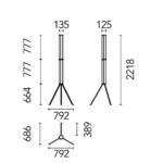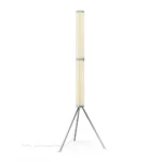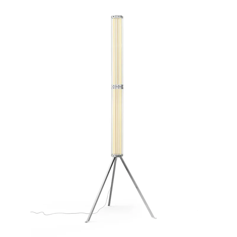 one or more hexagons of planar glass connected by a polished aluminum element, SuperWire lights up its entire surface thanks to a new source: a very thin, flat, soft, flexible LED strip measuring up to one meter, which emits a warm and homogeneous light along its entire length and which can be easily removed for replacement and repair, unique in the panorama of LED bulb-less lamps. This floor version, is built with two 75 cm high modules, placed one above the other, resting on a steel tripod, a tribute to the historic Luminator by the Castiglioni brothers.