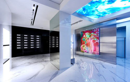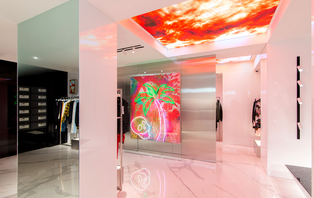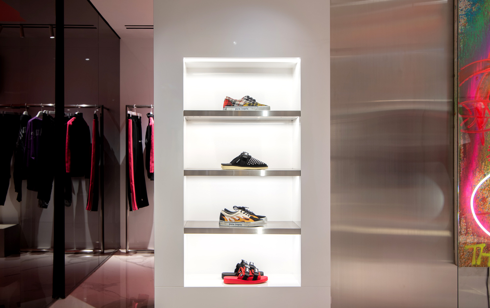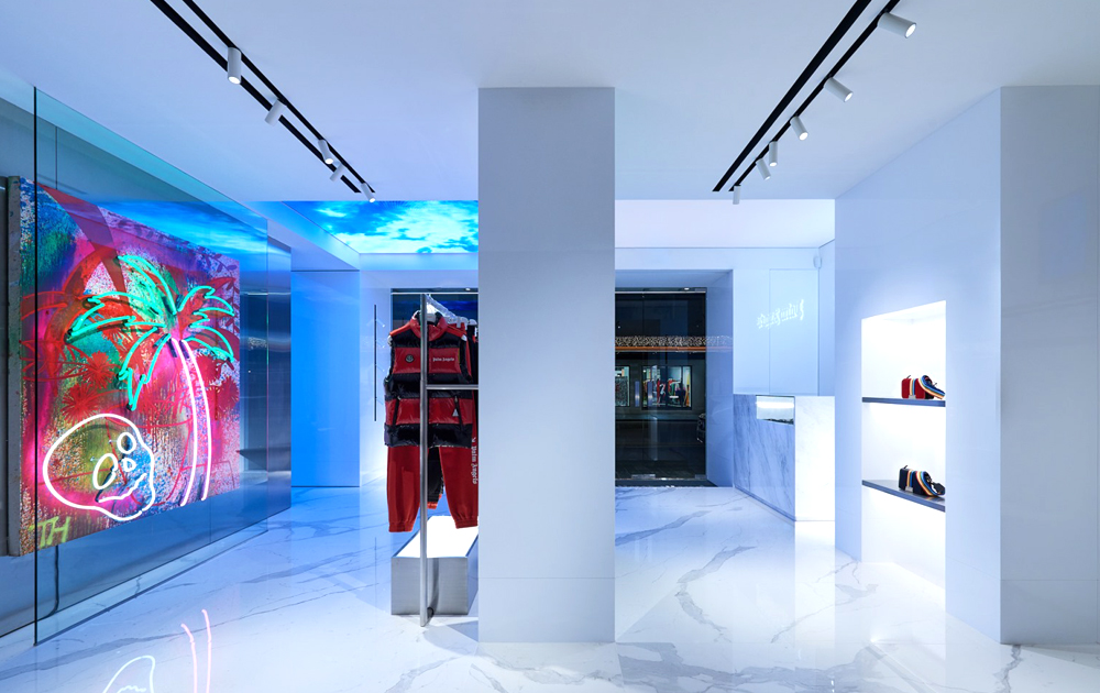 Located on boutique-infested Paterson Street in Causeway Bay, the lighting concept developed by Ragazzi and creative agency April was carefully coordinated to the various uses and provides interior lighting. Running Magnet from FLOS Architectural, the accent LED Spot modules can be rapid exchanged and repositioned without tools. Light elements are quick to position and connect automatically with Magnets. Thanks to the full integration of luminaires that can disappear inside surfaces, its magnetic installation offers a super easy way to design the light in Palm Angels.