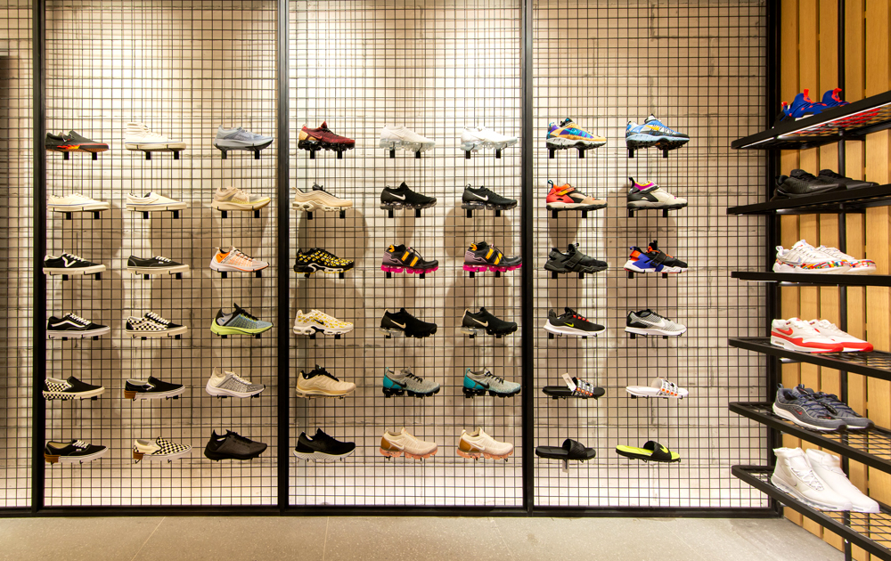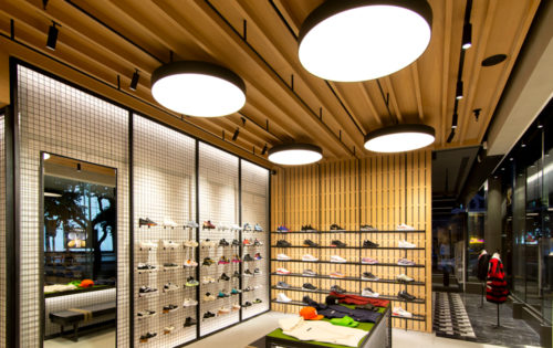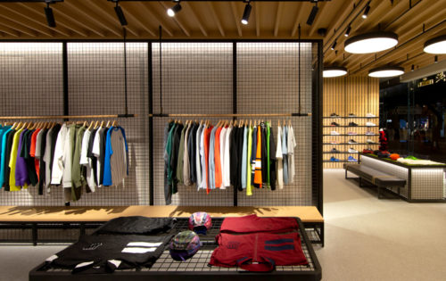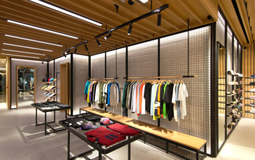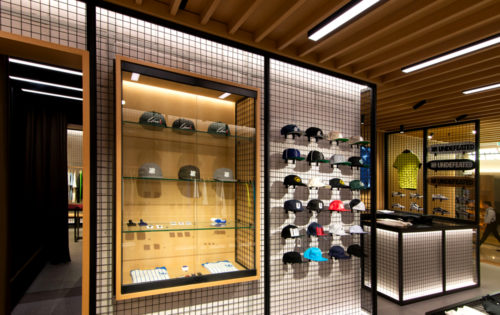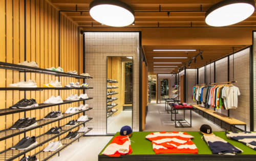 Furthermore, black wire racks and display cabinets play contrast to the white tile walls, as the store is captivated by a skylight that brings natural illumination inside.