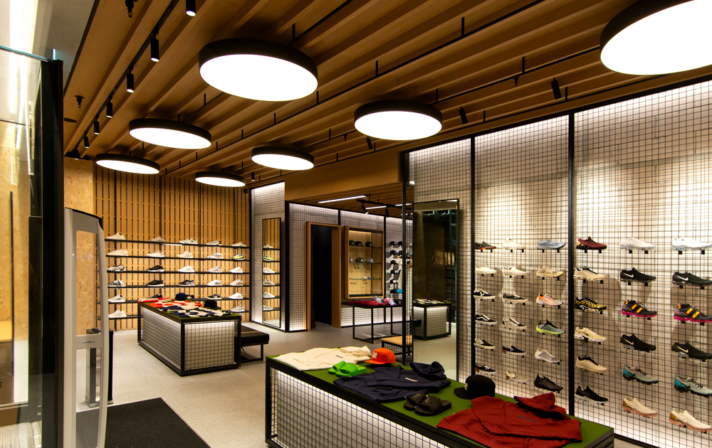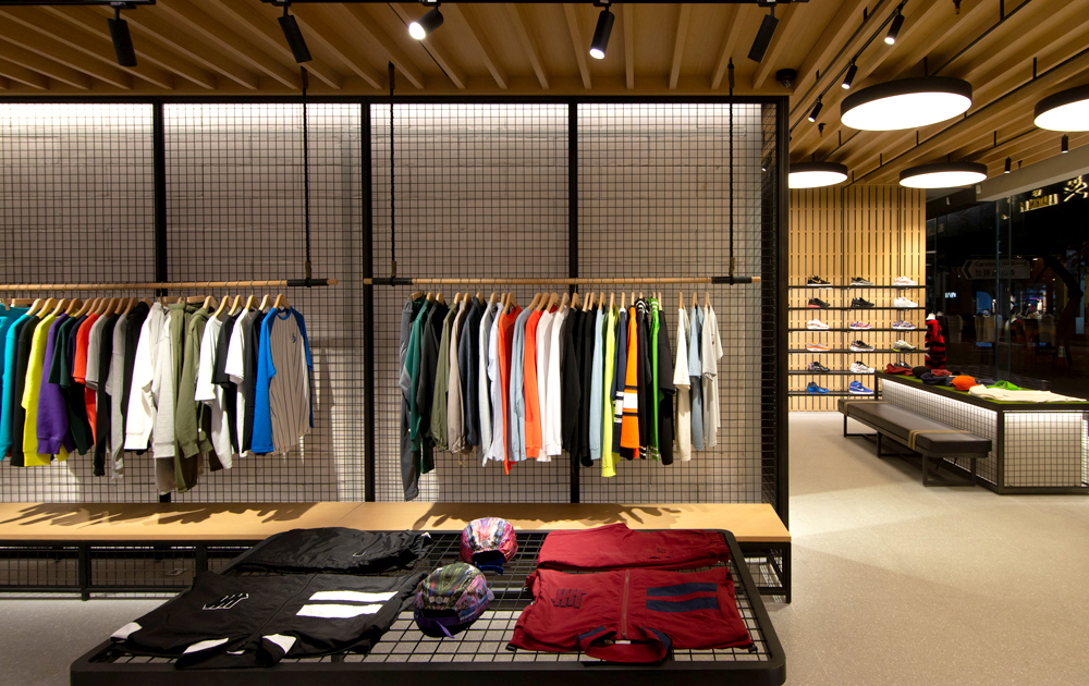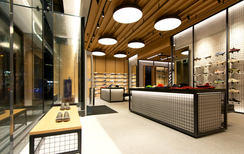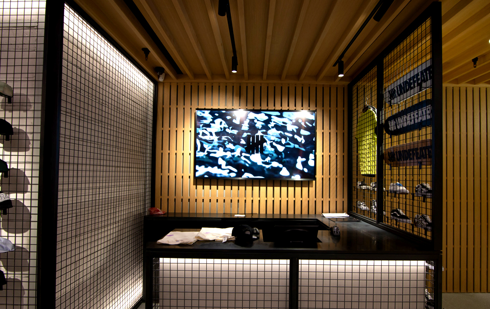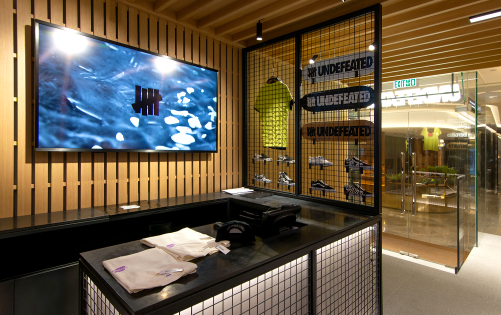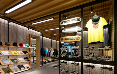 Backed by a retail concept designed to be a “modern lifestyle experience”, the flagship references a basketball court, incorporating a spacious locker room with wood construction against cement and marble flooring. UNDEFEATED logos are plastered all throughout the location, via black signage and white neon lighting.