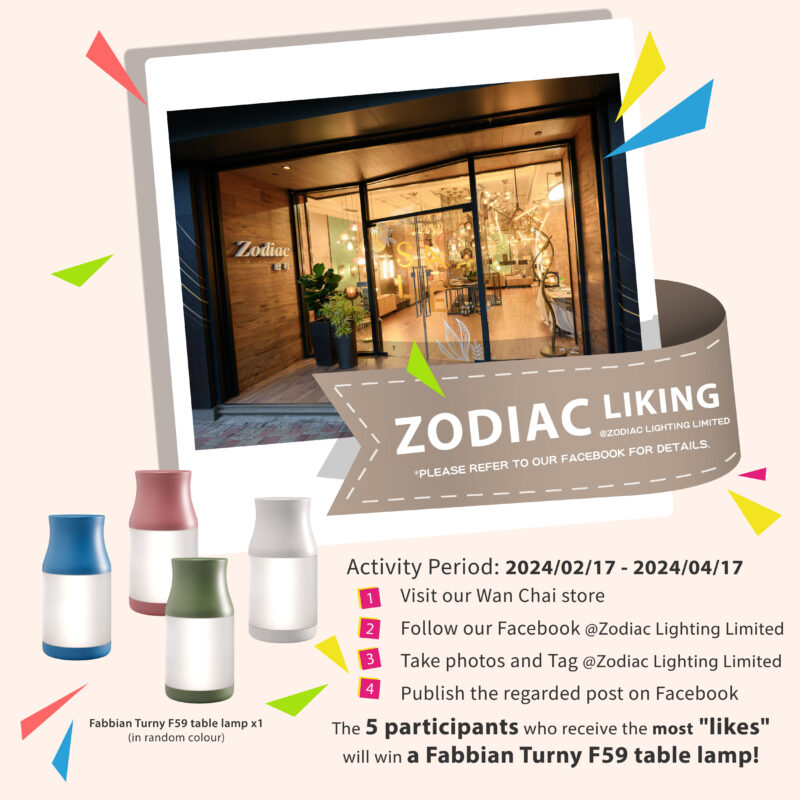 Result will be announced on 18 April 2024 on Zodiac’s Facebook and IG pages, and each winner will receive ONE Fabbian Turny F59 table lamp in a random color.