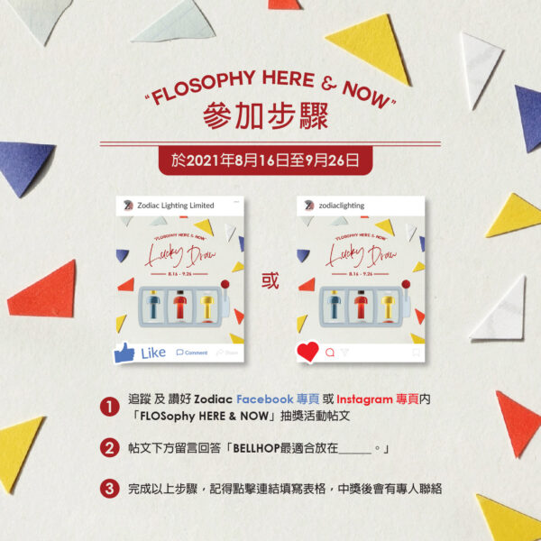 1. 於2021年8月16日至9月26日於 Zodiac Lighting Limited Facebook專頁或  Instagram 專頁內的 「FLOSophy HERE & NOW」抽獎活動帖文 – 讚好 (Like) 和 追蹤 (Follow)